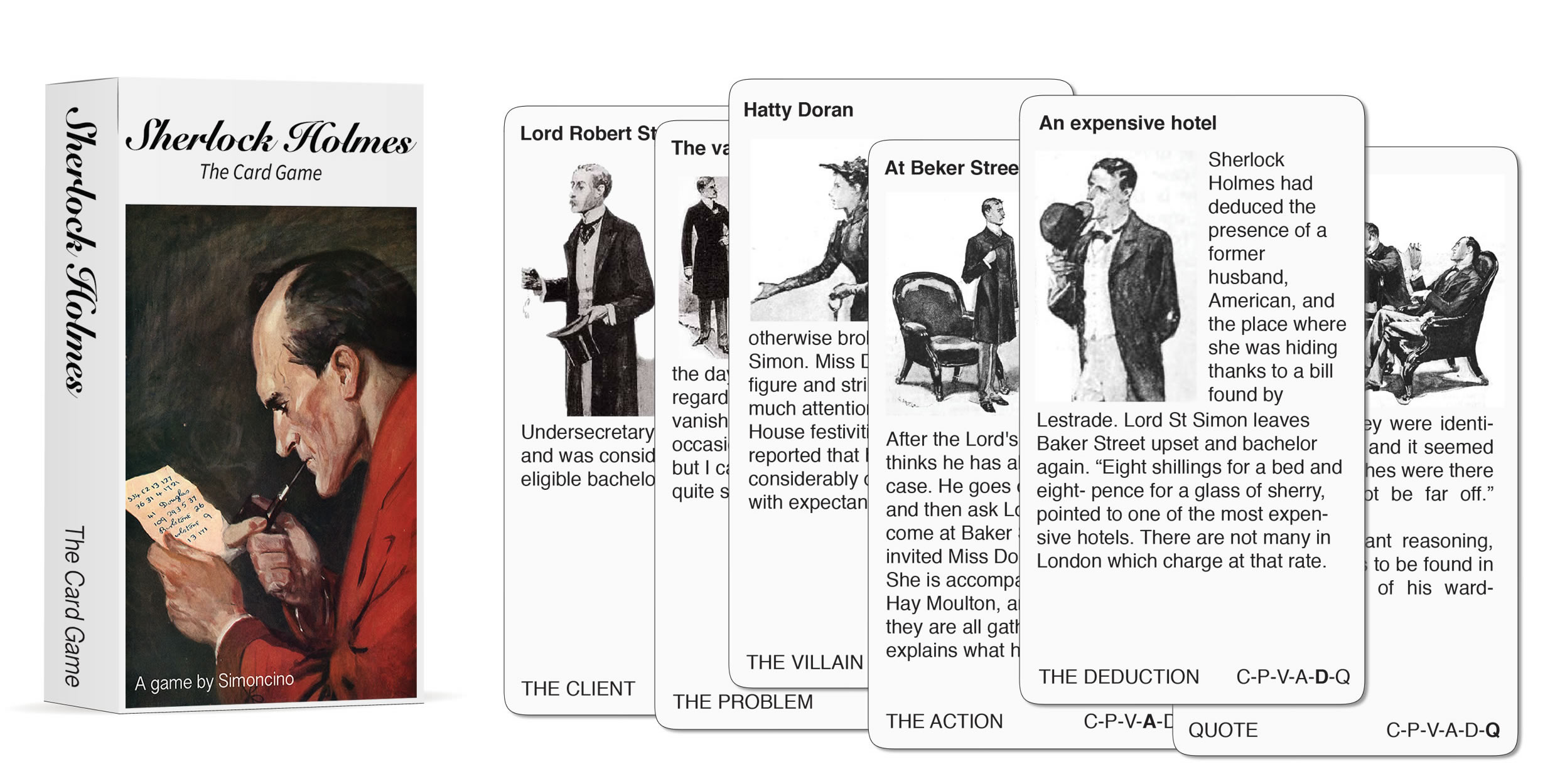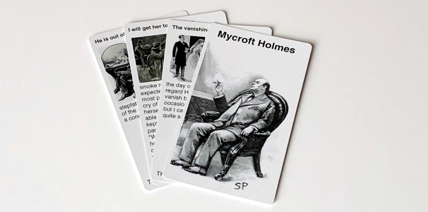 The plot of each Sherlock Holmes story is organized as a sequence* of the following cards: the Client, the Problem, the Villain, the Action, Deduction and final Quote.